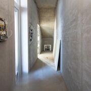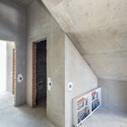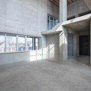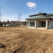 В основной же части дома, на первом этаже располагается ещё большей площади двусветная кухня-гостиная (49 кв.м.), просторная жилая комната с отдельной террасой, кабинет, холл с расположенной в нем межэтажной лестницей, гардероб, тамбур, коридор и топочная с отдельным входом, большой совмещённый санузел с естественным освещением, дополнительный санузел, помещения под сауну и спортивный зал.
