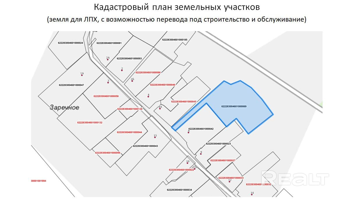 Хорошее транспортное сообщение с Минском, ходят маршрутки. В д. Заречное активно ведется престижная коттеджная застройка, что подтверждает привлекательность данной локации. В случае приобретения двух участков одновременно будет скидка по цене.