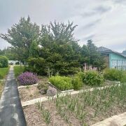 - Участок ровный правильной прямоугольной формы. Площадь участка составляет 25 соток. Есть свой парк с соснами и березами. На участке растут плодовые деревья, очень много кустов и цветов. Участок огорожен забором из металлопрофиля.