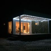 Дом наполнен естественным освещением благодаря панорамному остеклению двухкамерными стеклопакетами.