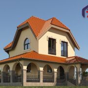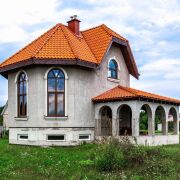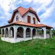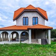 - Фасадный декор выполнен в итальянском стиле. Веранда, выходящая на южную и восточную часть, выполнена из монолитного бетона. Кровля на веранде - из керамической черепицы. Коттедж без внутренней отделки. Степень готовности - 80 %. Входных дверей нет, межкомнатных – нет, окна - 16 штук (пластиковые двухкамерные стеклопакеты с гранитными отливами).