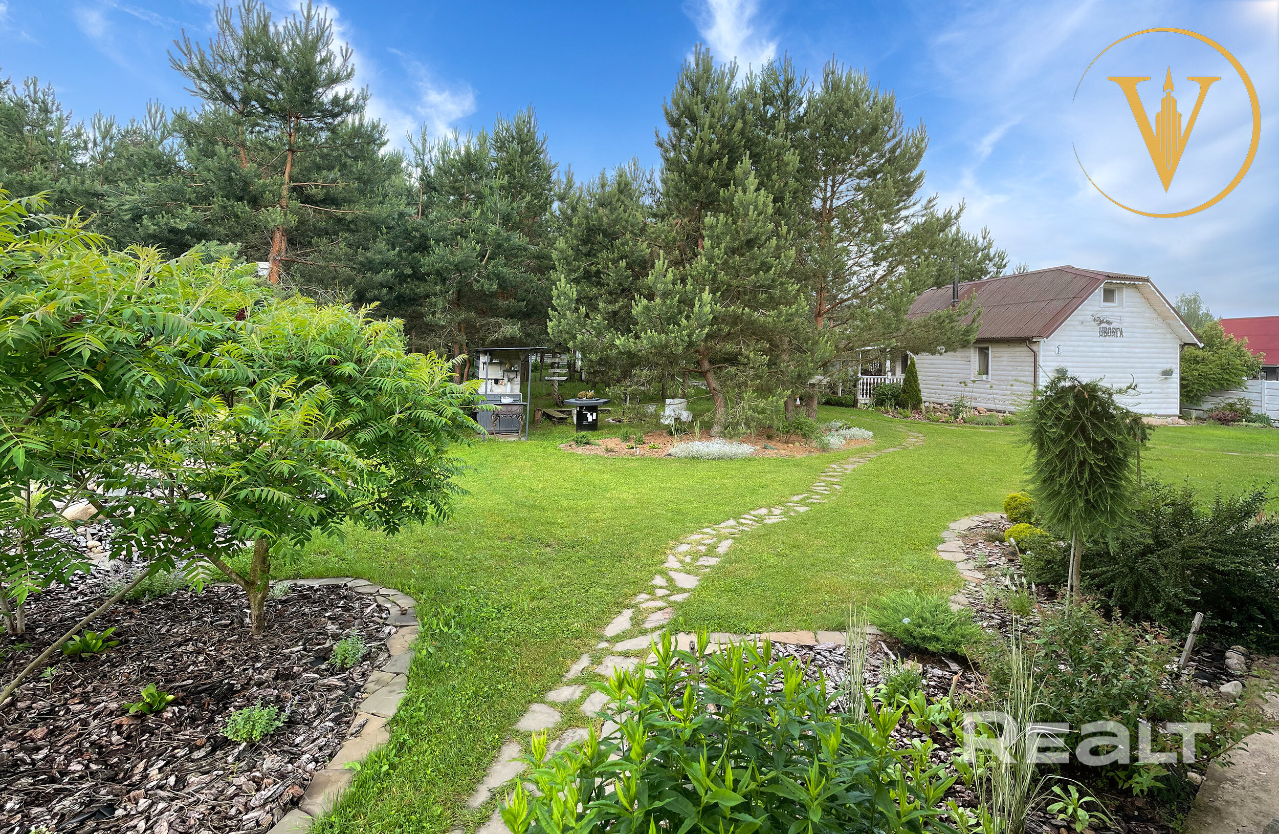 - Полностью ухоженная территория (ландшафтный проект) с лесной частью (сосны и берёзы, лесная земляника и грибы), мощение природным камнем и плиткой