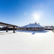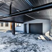 - Оборудован просторный гараж и навес на 2 автомобильных места с подъемными воротами Алютех. В гараже встроенное стеновое электроотопление.