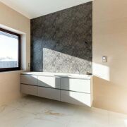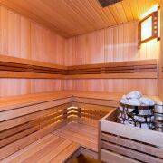 - Сауна отделана липовой вагонкой (топка Harvia). В постирочной умывальник со столешницей и отдельная лапомойка для животных из кварцевого камня.