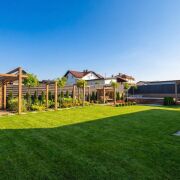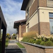 Качественный газон, установлен автополив, сетка от крота, дорожки выложены тротуарной плиткой;