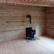 Сам дом бревенчатый с террасой, крыша - ондувилла. 20.5 м2. Установлена печь, сделаны выводы для воды.