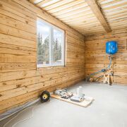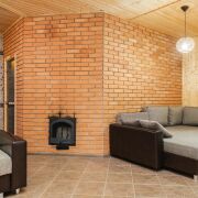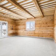 - Дом выполнен из бревна на прочном фундаменте ФБС с глубиной 1,2 м. Под полом установлены плиты перекрытия, что обеспечивает дополнительную устойчивость.