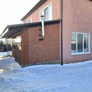 Площадь застройки дома 10.34 м. х 11.34м. Фундамент ж/б., стены блок газосиликат, перекрытия плита ж/б, кровля металлочерепица, большие окна ПВХ. Дом утеплен и оштукатурен.