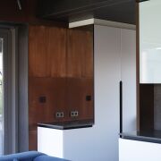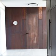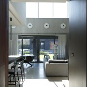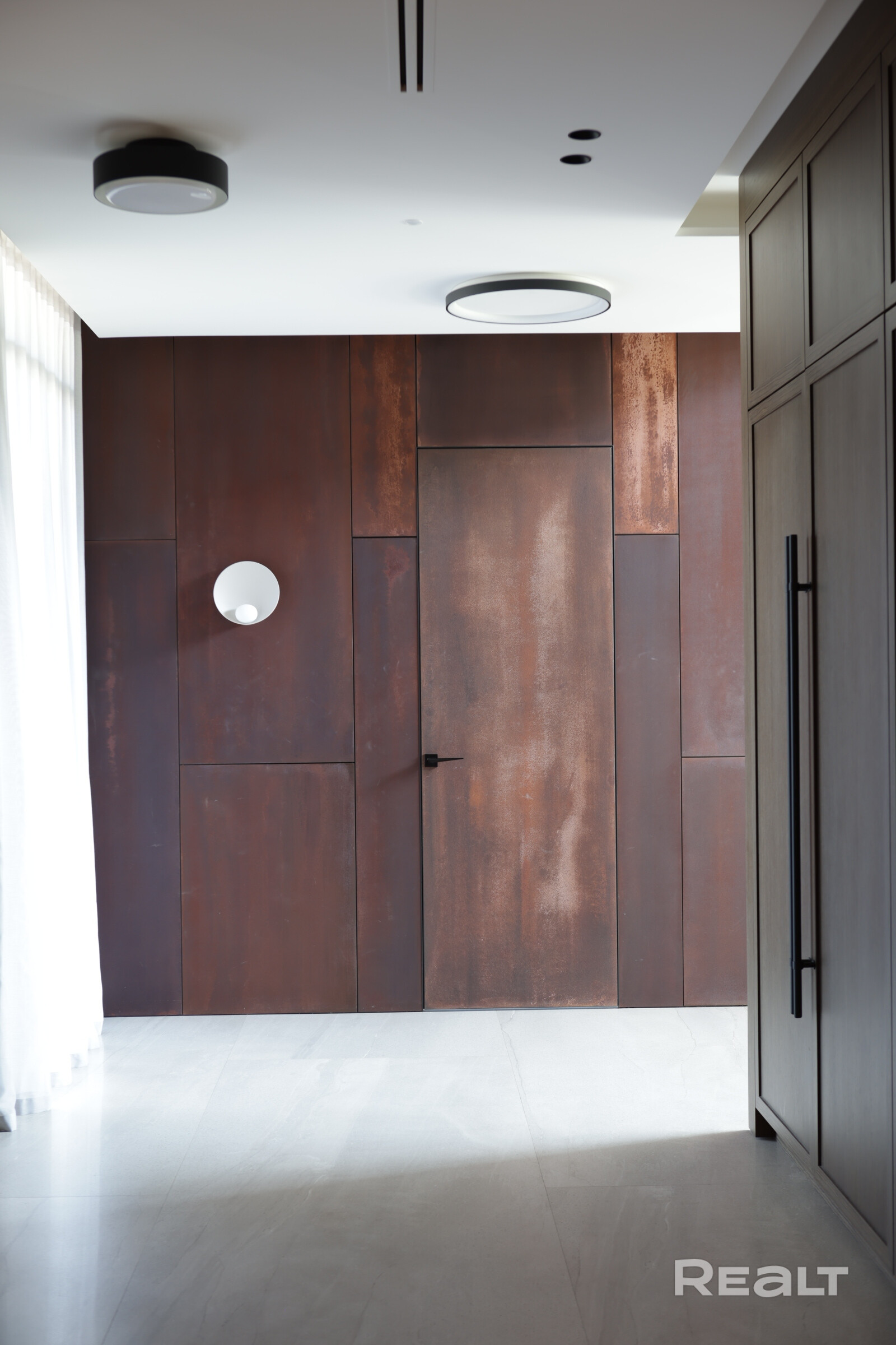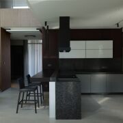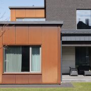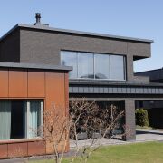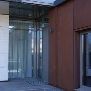 Фасады выполнены с облицовкой голландским клинкерным кирпичом Vandersanden черного цвета в сочетании с вентфасадом из кортеновой стали. Окна – алюминиевые.