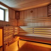 Баня реализована в контексте основного дома, в которой предусмотрена русская парная на дровах, уличный бассейн, терраса, комната отдыха, санузел, душевая и подсобное помещение.