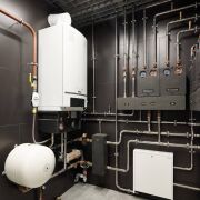 Дом оборудован двумя конденсатными котлами Buderus с обвязкой трубопроводов Rehau.