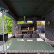 Зона барбекю с большой печью для гриля реализована под общей кровлей с баней.