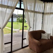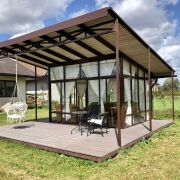 Пространство для жизни и творчества: Рядом с домом – стильная дизайнерская стеклянная беседка площадью 20 м2, дополненная просторной террасой 30 м2. Раздвижные окна позволяют наслаждаться видами в любое время года, а террасная доска из сибирской лиственницы добавляет изысканности.