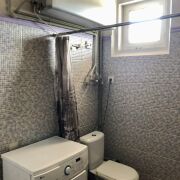 - Современный санузел с душевой кабиной и стиральной машиной.