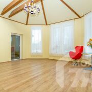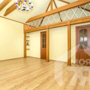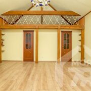 - Жилая комната (27,3 м2) с большими окном на участок. В зоне антресолей расположена спальное место.