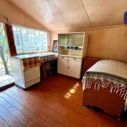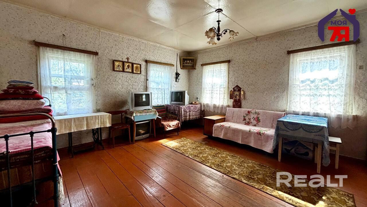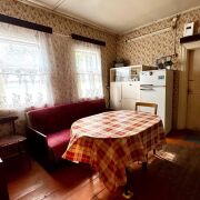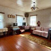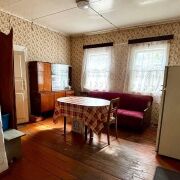 - Дом построен из бревен, с высоким фундаментом, что гарантирует его долговечность и отличные теплоизоляционные характеристики. Полы из деревянной доски, а стены обклеены обоями.