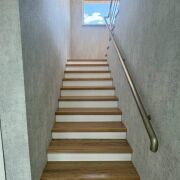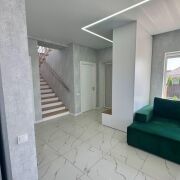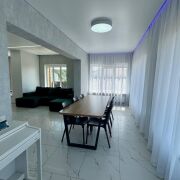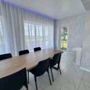 Общая площадь дома — 156,1 м2, жилая площадь 65,5 кв.м.,большая кухня-гостиная 47,5 м2, два санузла, удобная планировка, продуманные зоны хранения. На первом этаже — большие окна с видом на природу, тёплые полы по всей площади, стильная отделка. Монолитная лестница с дубовыми ступенями, современная кухня с техникой.