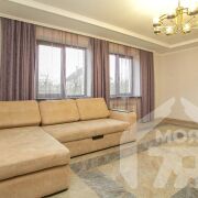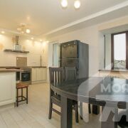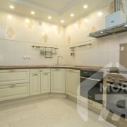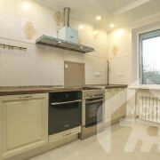 -Кухня выполнена в европейской классике: светлые фасады, качественная фурнитура, продуманная рабочая зона и керамогранитный пол создают ощущение солидности и удобства. Плиточный фартук с декоративными вставками освежает пространство, встроенная техника подчёркивает функциональность, а мягкая подсветка по периметру задаёт атмосферу уюта. Столовая зона с большими окнами наполняет пространство дневным светом и идеально подходит для семейных ужинов или приёма гостей.