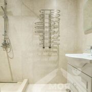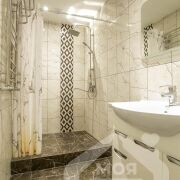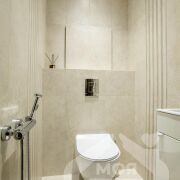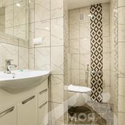 -Санузел оформлен в современном минимализме: плитка в спокойных бежево-серых тонах, душевая, и качественная сантехника - всё говорит о продуманности и внимании к деталям.