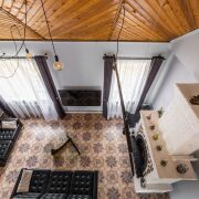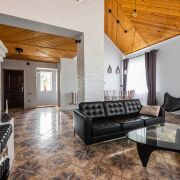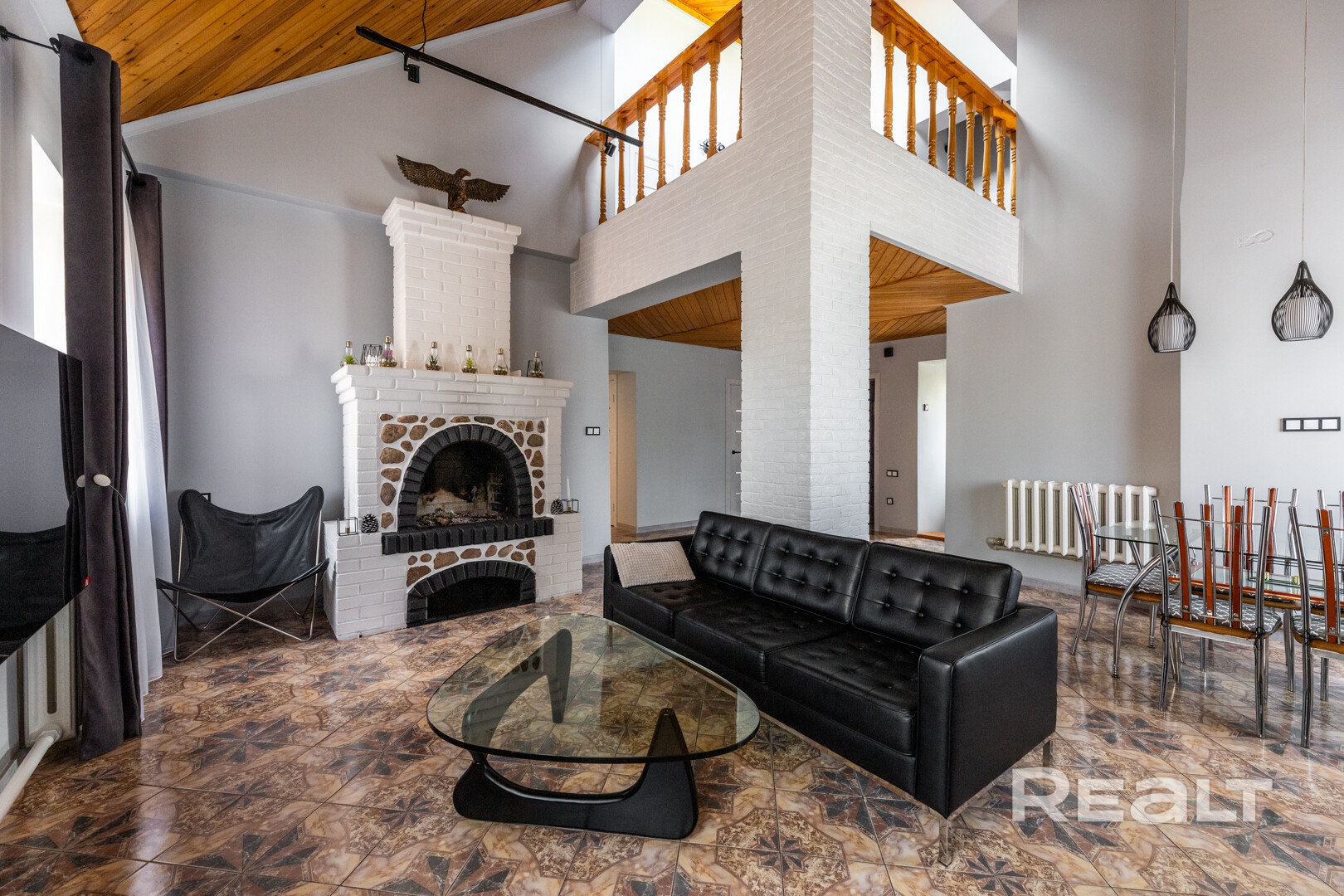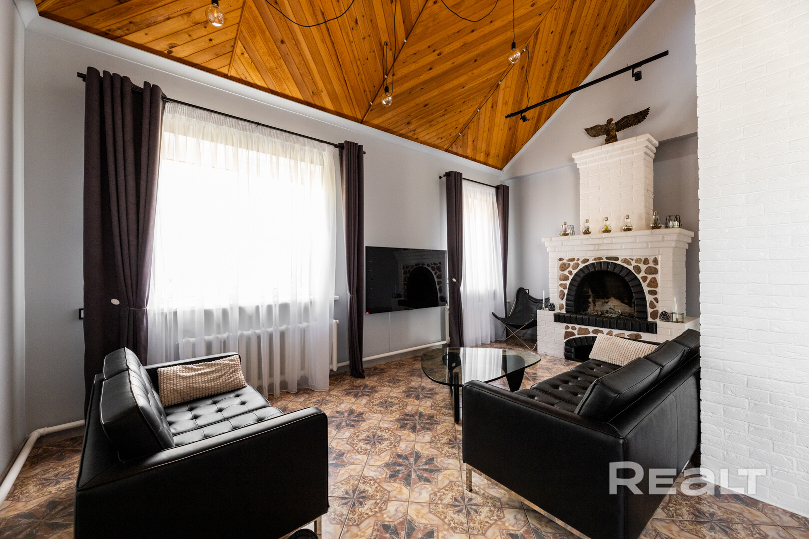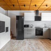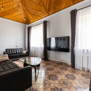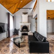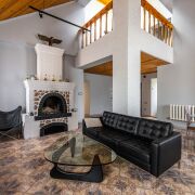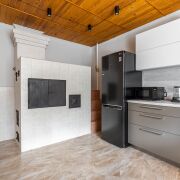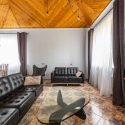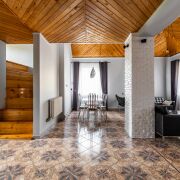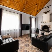 На 1-ом этаже находится большая гостиная с кожаными диванами и настоящим уютным камином, жилая комната и кухня, раздельный сан узел с большой душевой.