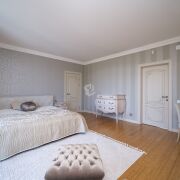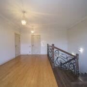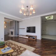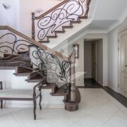 Лестница с настоящей художественном дизайнерской ковкой и межкомнатные двери выполнены на заказ по индивидуальным эскизам из теплого и долговечного массива ясеня, полы из экзотических твёрдых пород бамбука и палисандра.