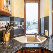 Просторная кухня, оборудованная всей необходимой бытовой техникой и столешница из самого прочного французского гранита