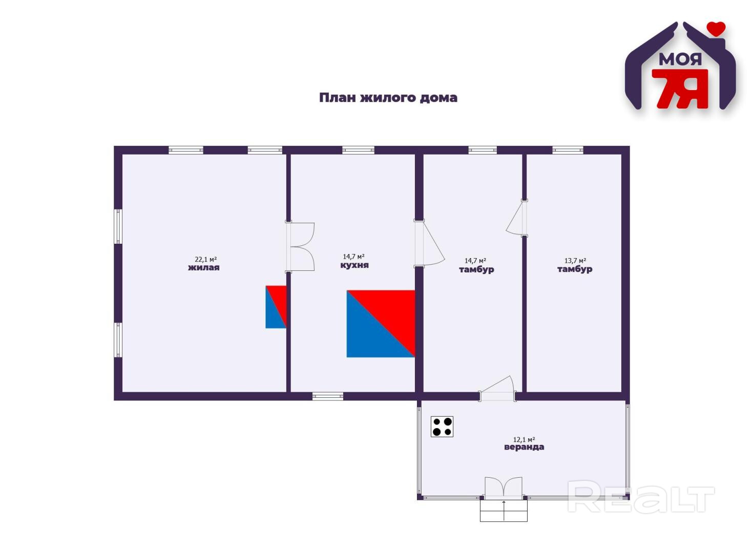 - Просторная жилая комната площадью 22,1 м2 — сердце дома, где можно разместить всю необходимую мебель и создать уютное пространство для отдыха.