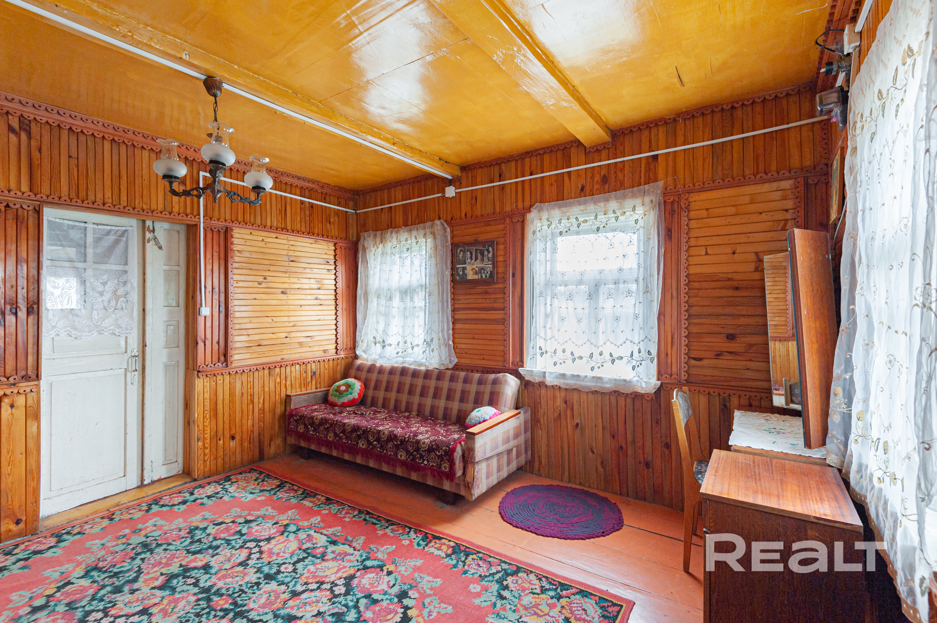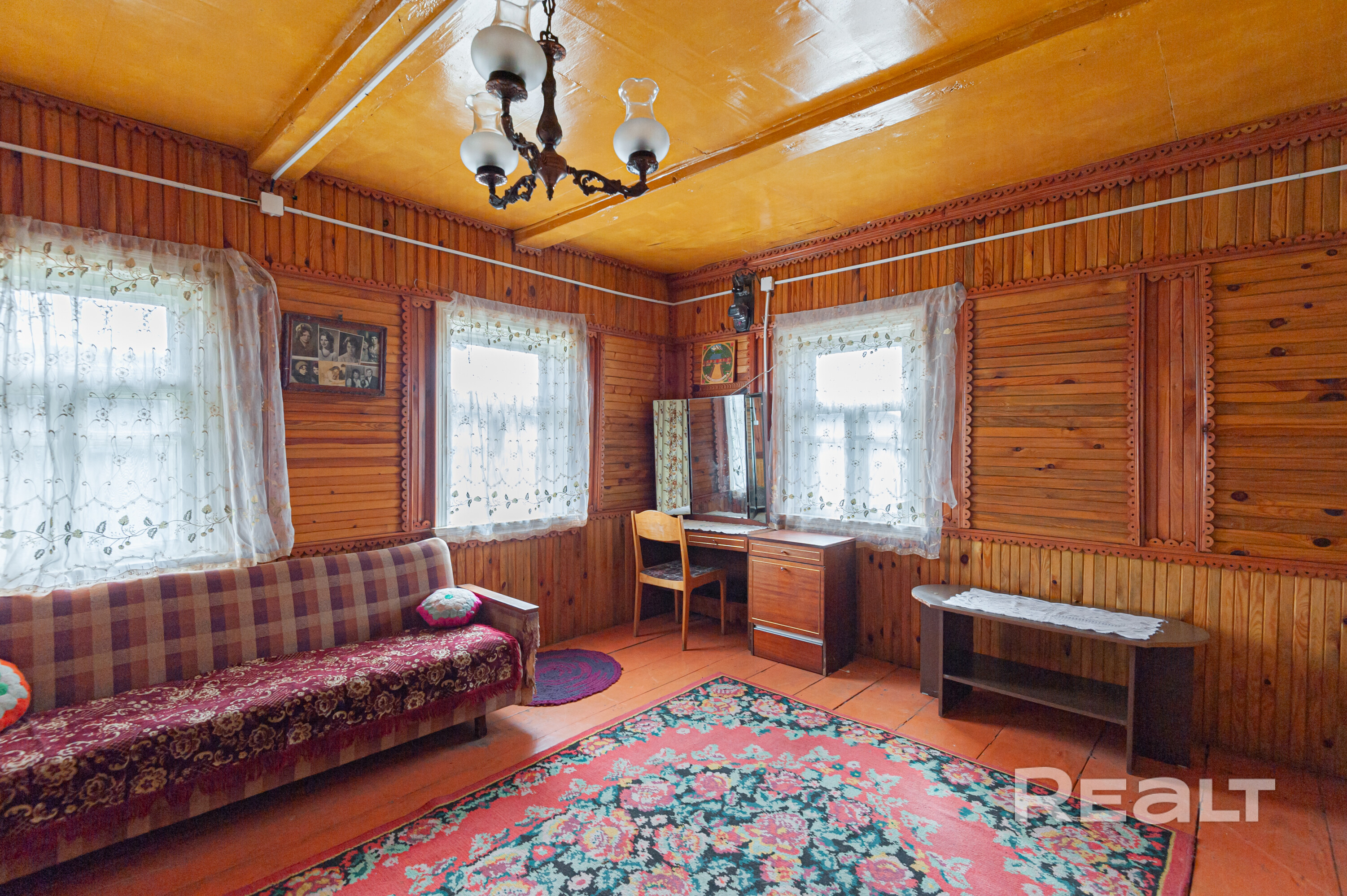 · Дом — 80 квадратов. Год постройки 1954. Выполнен из деревянного сруба. Состояние сруба — хорошее (это редкость для такого возраста). Дому нужен косметический ремонт и обновление инженерки по вкусу, но сам сруб крепкий.