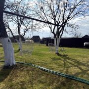 · Ровный, ухоженный участок: засеян газоном, растут туи и плодовые деревья.