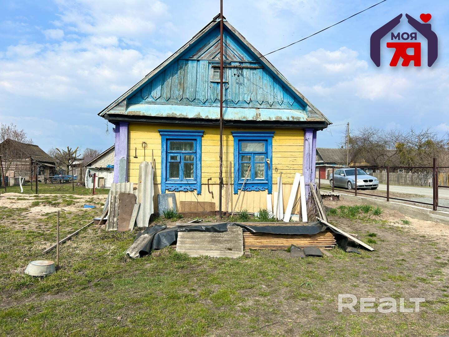 -Бревенчатый, одноуровневый дом с шиферной крышей.