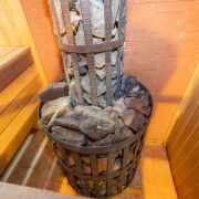 На участке гараж на два автомобиля, качественно оборудованный банный комплекс, аккуратная хозпостройка.