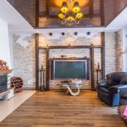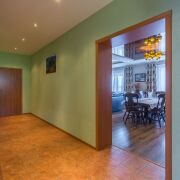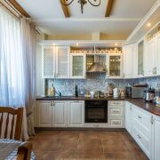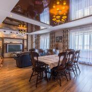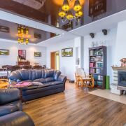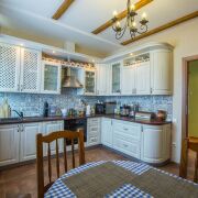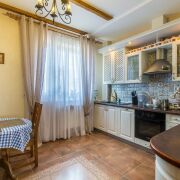 Кухня светлая и элегантная, оборудована техникой BOSCH: индукционная плита, посудомоечная машина. Большая и шикарная гостиная в классическом стиле с камином. В коридоре, санузле и кухне полы - керамическая плитка с подогревом. На мансардный этаж ведёт лестница из массива ольхи и дуба.