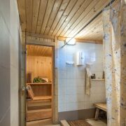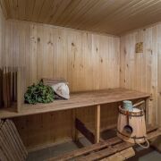Полноценный высокий цокольный этаж содержит: подсобные помещения для хранения, топочную, сауну с комнатой отдыха, летнюю кухню. Из цокольного этажа предусмотрен удобный выход на участок к зоне отдыха.