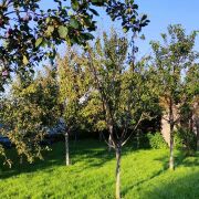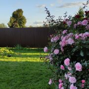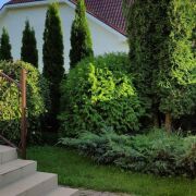 Вокруг дома очень красиво, на участке ландшафтный дизайн: дорожки выложены плиткой, высажены туи и другие декоративные растения. За домом есть аккуратная хозпостройка и сад. Все деревья (яблони, груши, сливы, вишни) и кусты - взрослые, плодоносящие. Ближе к концу участка расположены беседка и пруд, они образуют уютную зону отдыха.