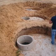 ТРИ канализационных колодца, каждый из которых имеет объем 9 куб.метров (ж/б кольца диаметром 1.5м, глубиной 6 метров). Общий объем канализации - 27 кубометров. Канализацию обустраивали сообща с соседом. (смотреть фото файлы)