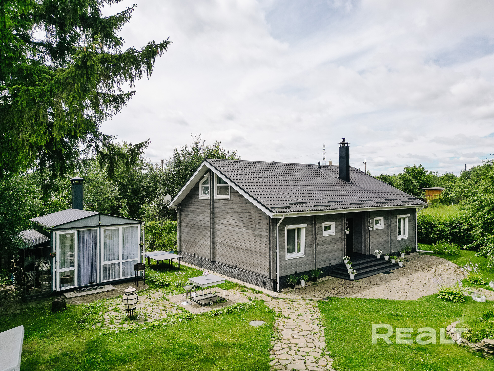 Открытая терраса с комплектом садовой мебели (стол, кресла, качели) - вход из гостиной и со двора. От соседей терраса закрыта зеленой изгородью.