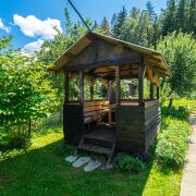 На участке размером почти 6 соток установлена добротная беседка 2023 года постройки, имеется мангал, умывальник с проточной водой, добротный сарай. На территории участка аккуратные грядки и клумбы, молодые плодовые деревья, газон. Есть собственный выход к лесу через калитку.