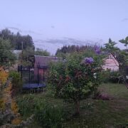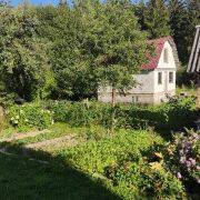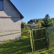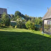 Участок 5 соток, огражден со всех сторон сеткой-рабицей. Есть несколько плодовых деревьев, много цветов и кустарников. Летом очень зелено и красиво.