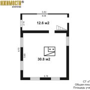 1 этаж: веранда, кухня; печь, гостиная, гостевая спальня – свободная планировка- 43,4 кв.м.