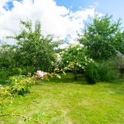 Участок ровный и ухоженный. Квадратной формы. Уютный сад с газонной травой, деревьями и цветниками.