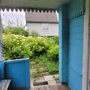 На участке в 4 сотки расположены компактный деревянный домик с мансардой , балконом и террасой, дровник, баня, утопающие в зелени.