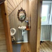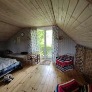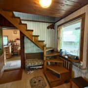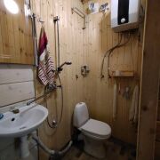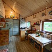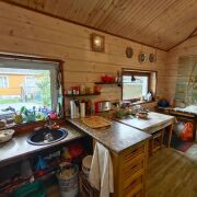 На первом этаже- кухня, гостинная с каминной печью, 2 комнаты, сан.узел( туалет, душ)