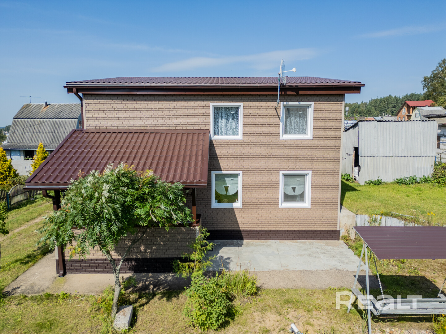 - Зеленый газон, декоративные растения и цветники, плодовые яблоня и вишня, кустарники крыжовника, малины и смородины. Качели, и никакого огорода — отдыхайте, а не работайте!