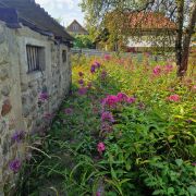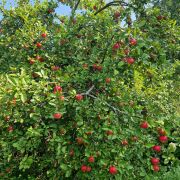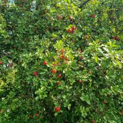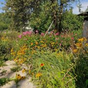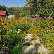 На участке поздняя груша, поздняя яблоня (2 шт), черная смородина, малина, цветы.