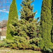 На участке много цветов , кустарников, красивые туи .