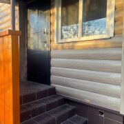 • Материал стен — белый кирпич утеплен каменной ватой 5 см. и обшит металлопрофилем, крыша — металлочерепица