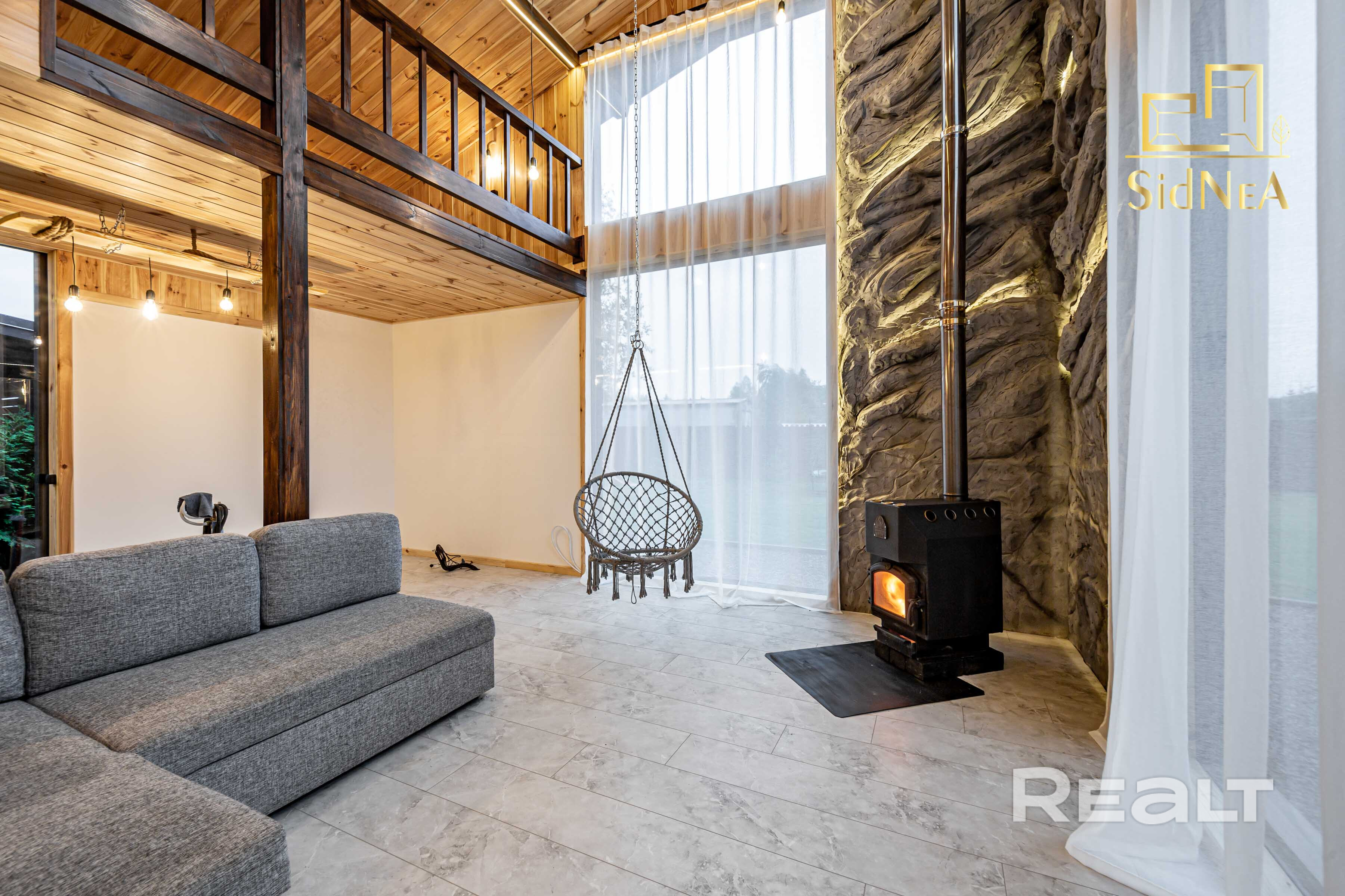 Основной дом 6х8 метра в 2 уровня. С большим панорамным остеклением и высотой потолка до 5,5 метра.