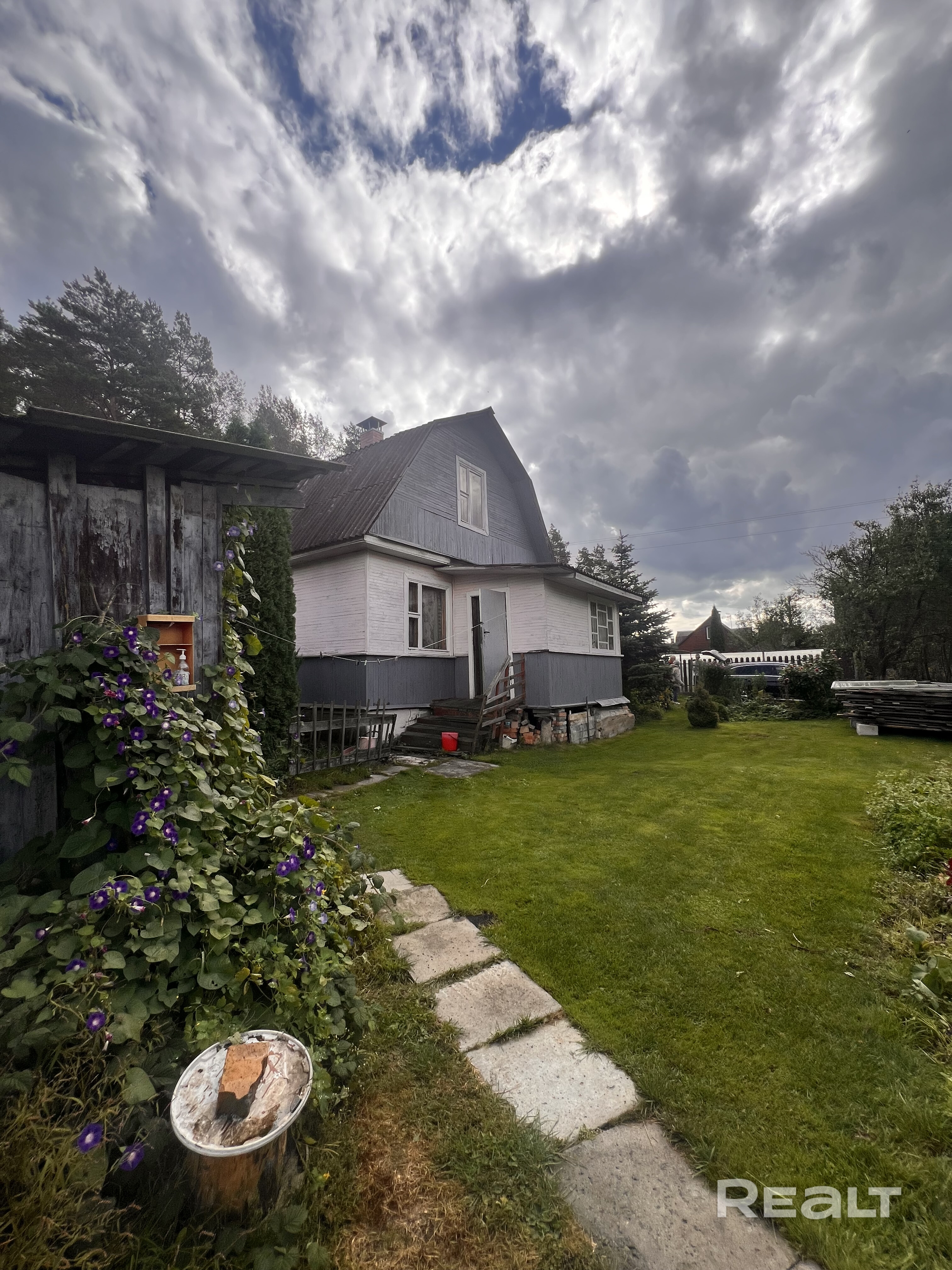 На участке есть хвойные деревья и парник.