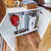 На первом этаже из 23.6м2 расположены: санузел, душевая комната с бойлером, кухонная зона с холодильником и стиральной машиной, жилая/спальная зона, места для хранения, мебель.