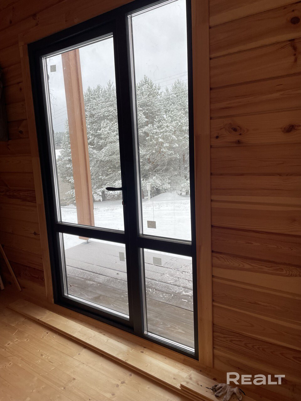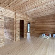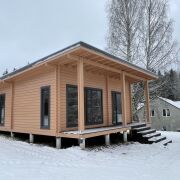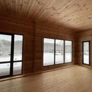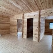 Дом одноуровневый, на свайном фундаменте, выполнен из клееного бруса толщ. 70мм, кровля - из металлочерепицы.